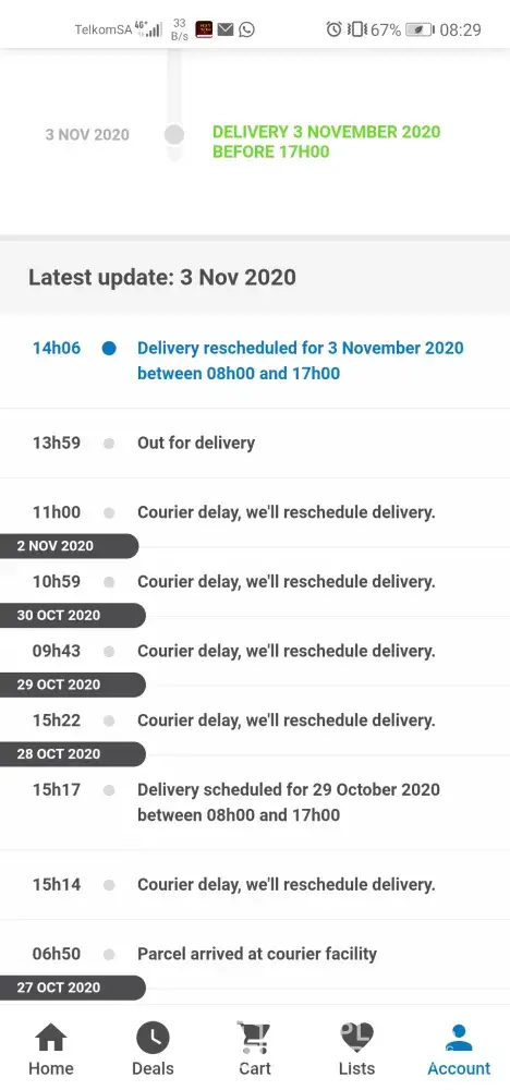 Goods I ordered from Takealot had a delivery due date of 27/11/2020. I track my Takealot deliveries via the Takealot app.