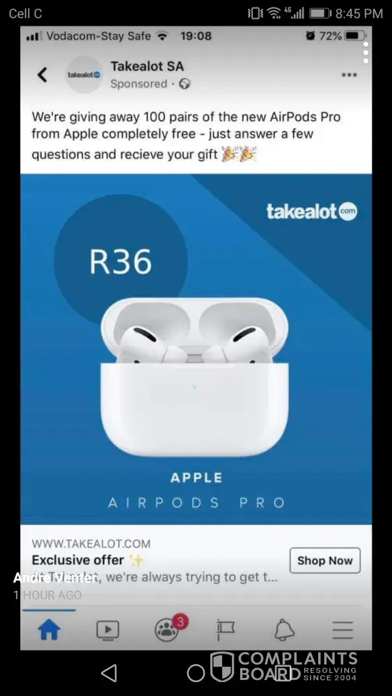 I have bought a pair of airpods for r36 on your facebook page it took me to checkout and it went off the bank... R800 went off my account I immediately called my bank and they informed me it is a overseas account that deducted the money of my account and I need to close my card as they will now repeatedly take money from my account, I checked yesterday and today and that add is still on there page... What must I do now you can look I am a super customer but now more than upset! Please assist