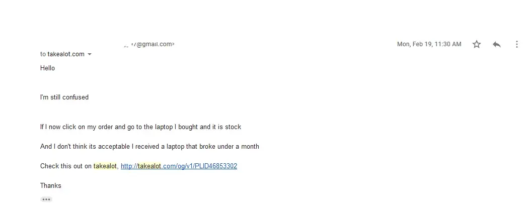 2018-10-19 I haven't received feedback after being promised by Renika Benjamin and Xavier Mouton and emailed Takealot again at 07:53 for feedback regarding my laptop. No response.
