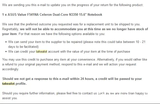 2018-10-22 I emailed Takealot for feedback regarding the replacement of my laptop. I received a response from Austin Lategan: "Kindly note that I will need to follow up with our DC and as soon as I receive feedback I will contact you right away."