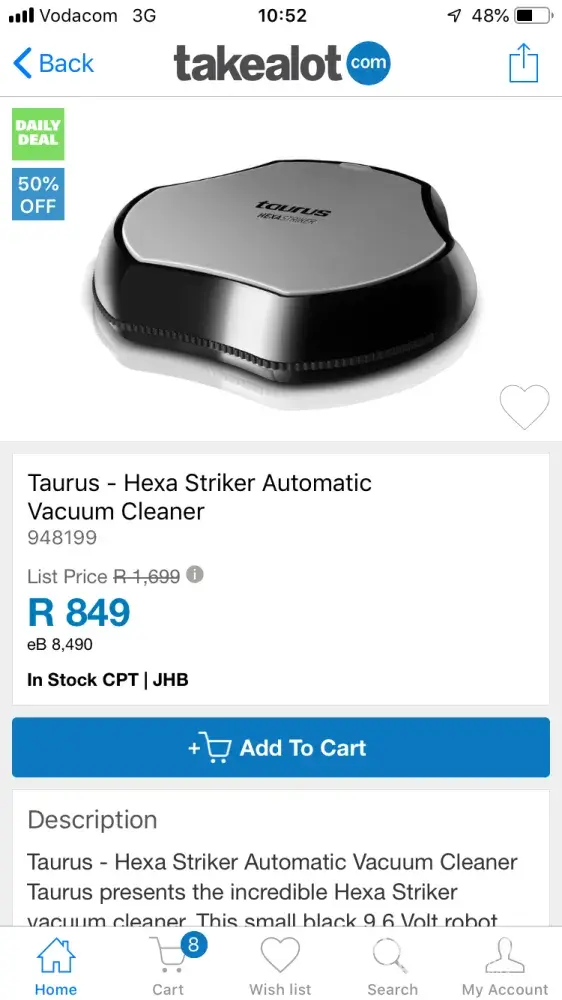 Over the last year for instance, the Taurus Hexa Striker automatic vacuum cleaner has been on sale for R999.00 (even when there is no discount) - I know this because I was interested in purchasing one.