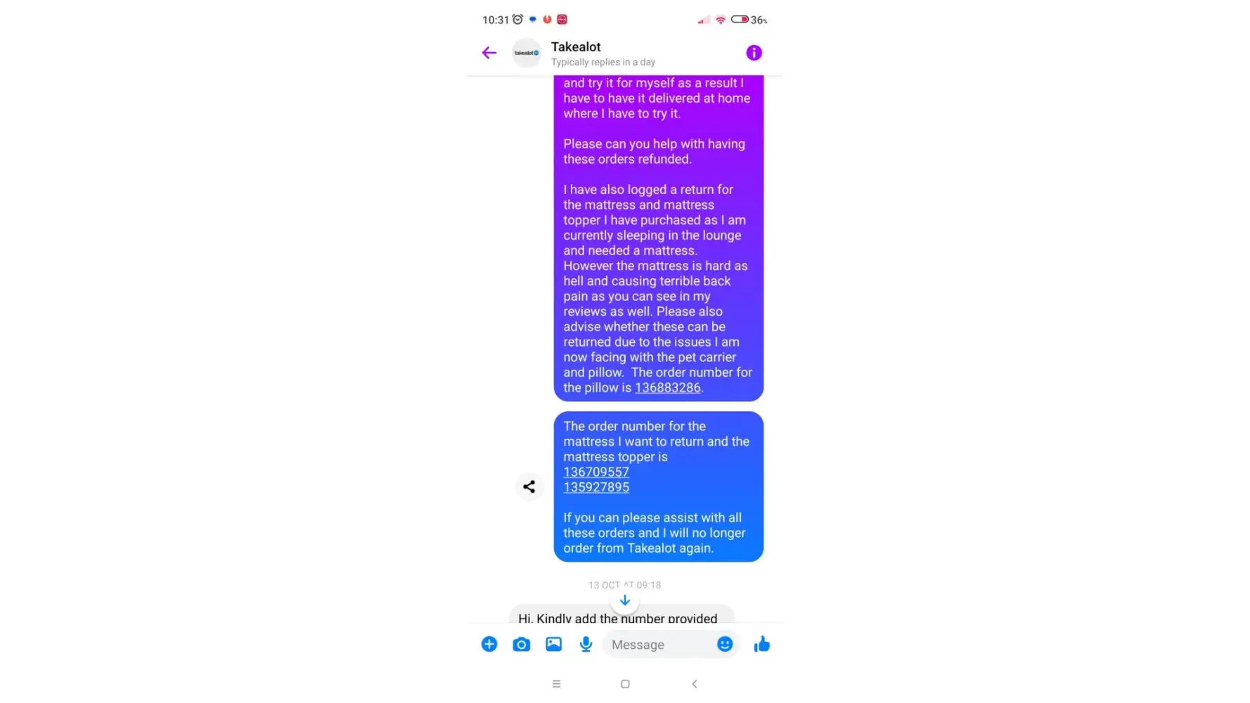 i ordered 2 items on takealot the 1 was wrong i than called and requested the order to be cancelled next thing its being delivered i than reject the delivery and the driver refuses i call and they than request a collection after 5+ calls to them fine it gets collected and states to be refunded now i get an email saying they sending me a replacement i than call again saying i did not request a replacement and get the run around again saying wait for sms than call us again to cancel the order i mean going for a week now trying to get a refund on one item and still not getting help what do i do please i call again and request to speak to a manager i get told they can only send an email for a manager to call me next week this is really fustrating and unhelpful