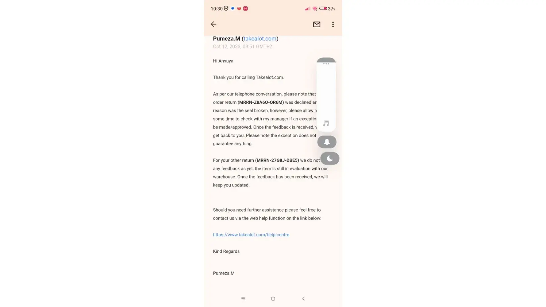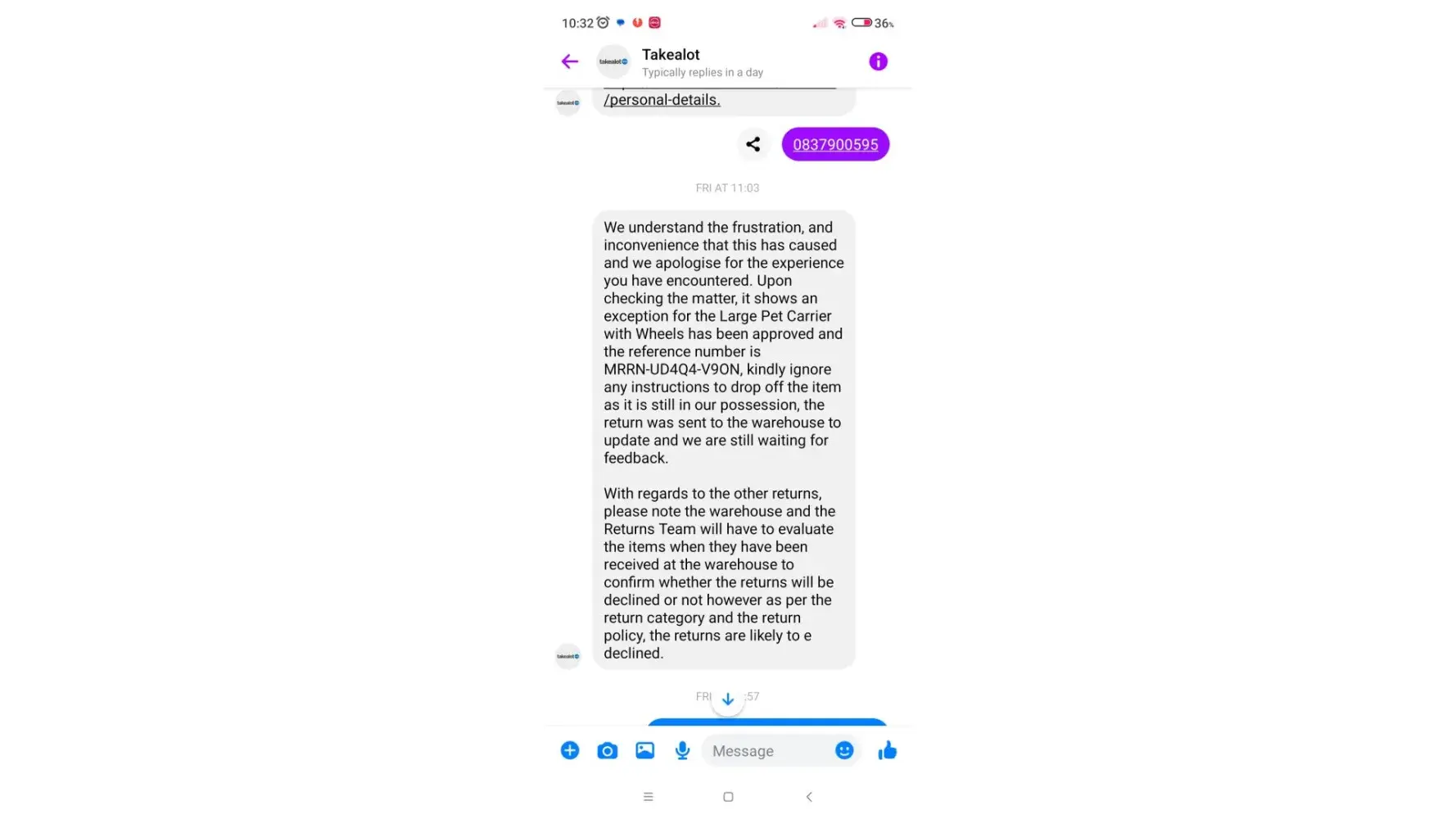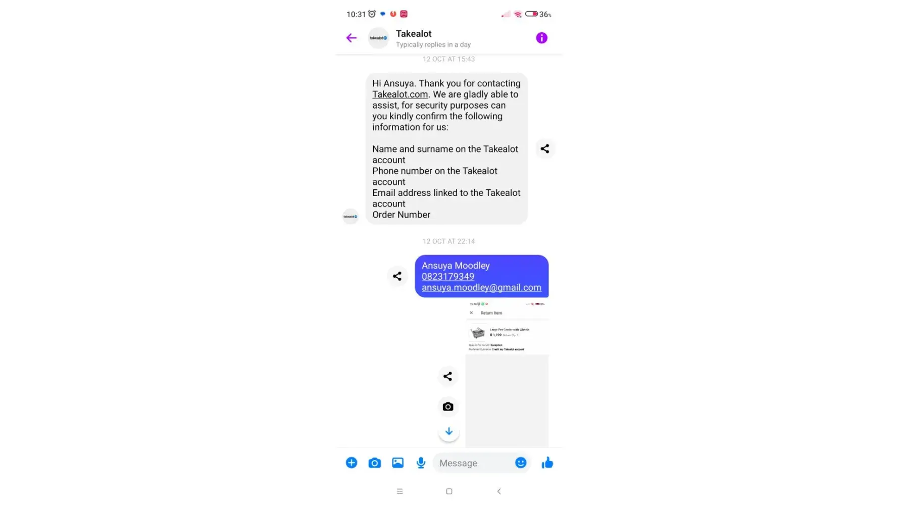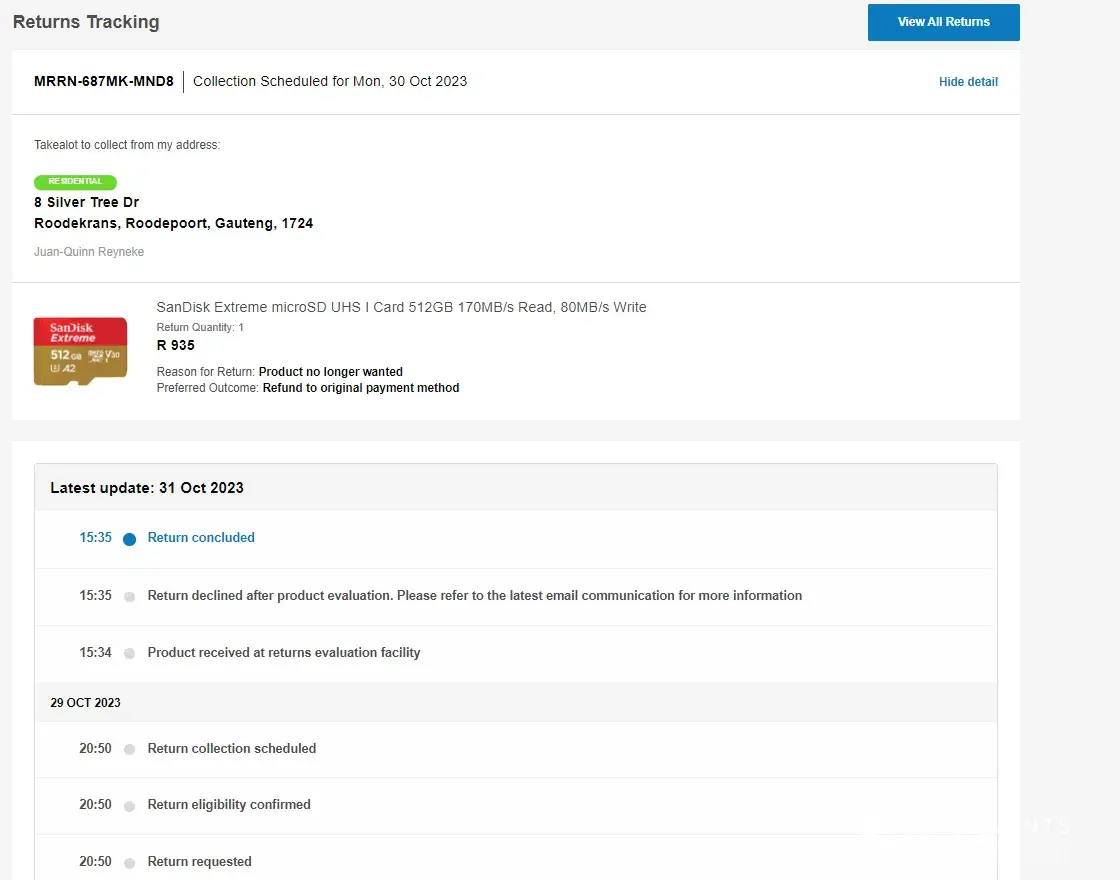 So yes, I scheduled the return because I spoke to Mr. ***********, and trust me when I say this, I was willing to spend money in the future and provide your company with continuous support from my side. But I promise you I will head and warn anyone who wishes to join Takealot to NEVER purchase from you again.
