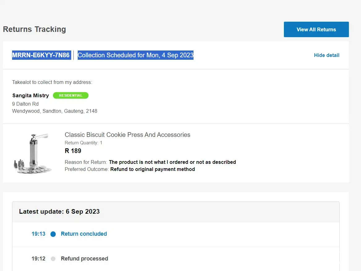 I received a Gift Voucher from my workplace for R500 for Takealot. I purchased a few items and had to pay the difference of R141.00. I returned the buscuit machine at this was not to my standards and it did not match the review that it displayed on the site. I logged the return on Takealot and the gentleman collected the item from me. Takealot credit me with R141 and the Machine price was R189, MRRN-E6KYY-7N86 Collection Scheduled for Mon, 4 Sep 2023
