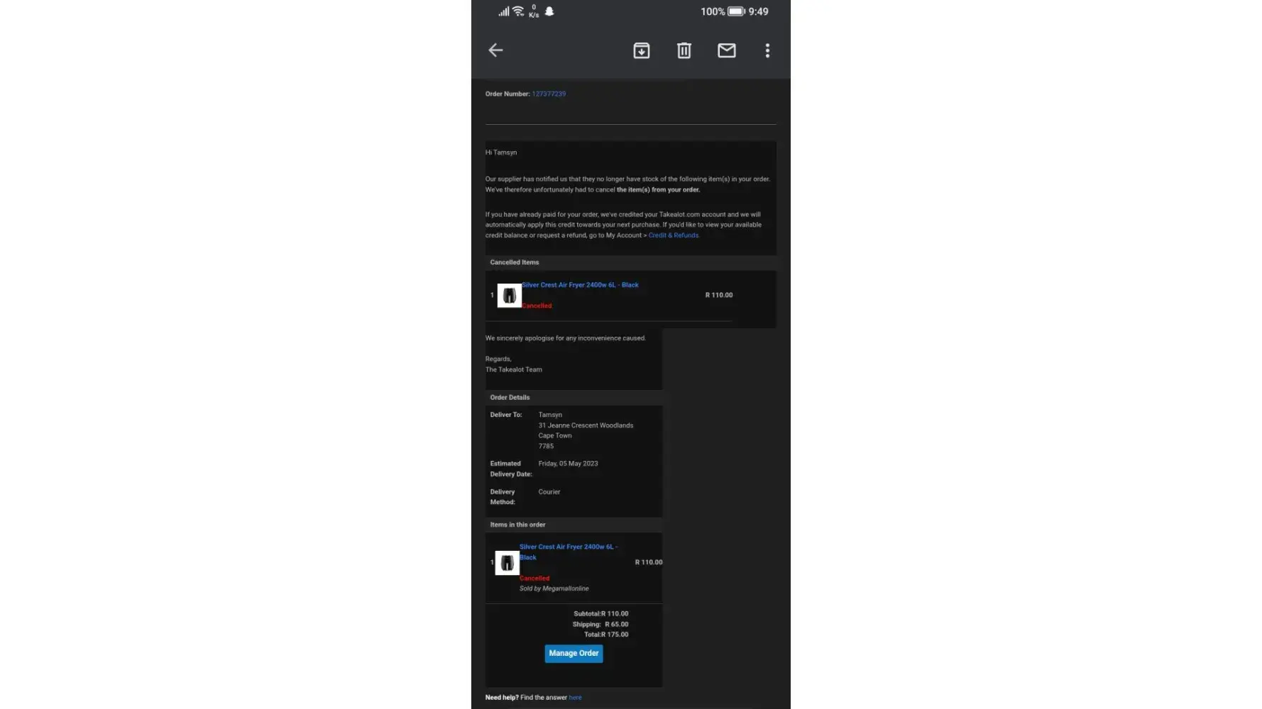 I'm very disappointed and frustrated at this incident that took place yesterday. As I scrolled throw takealot looking for a air fryer, to my surprise I saw one that shown 90% discount and it original price was R1100, sale price was R110, as a consumer i had right to purchase the item, I did and paid for it, they confirmed my order and payment sayin it I'll be delivered in 5-7 business days, I was so happy that I finally got one for cheap as air fryer is expensive, It was going to be a mother day gift. This morning to my surprise takealot canceled my order apparently "no stock" then why not indicate that before I purchased it? I'm very upset as I always buy from takealot and I love their items, how can this happen they obviously made a mistake with the price because after I ordered they changed the price to R995, I AM , I AM DISAPPOINTED IN THEIR SERVICE, as a consumer I have to pay the price I saw now they wanna refund me. I want my PRODUCT