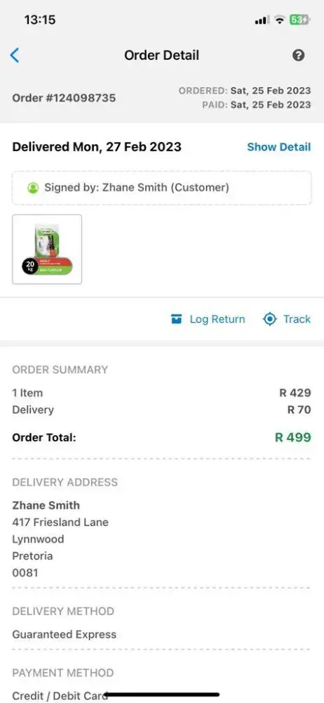 I ordered dog food from Takealot and paid R70 extra to have it delivered on Monday, 27 Feb 2023, however, the product was not delivered on 27 Feb, only on the 28th Feb. So, why pay R70 to have it delivered on a date you helped me to select and i pay for that but it is then not delivered? Also, It says that Zhane signed for this but she did not. I do not know who signed for it, most-likely it was my maid and the product was only delivered then to me on Tuesday, 28 Feb 2023 in the afternoon. I have really had better service from Takealot. I am really disappointed.