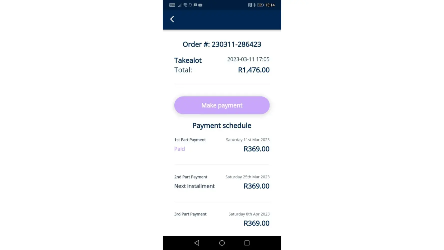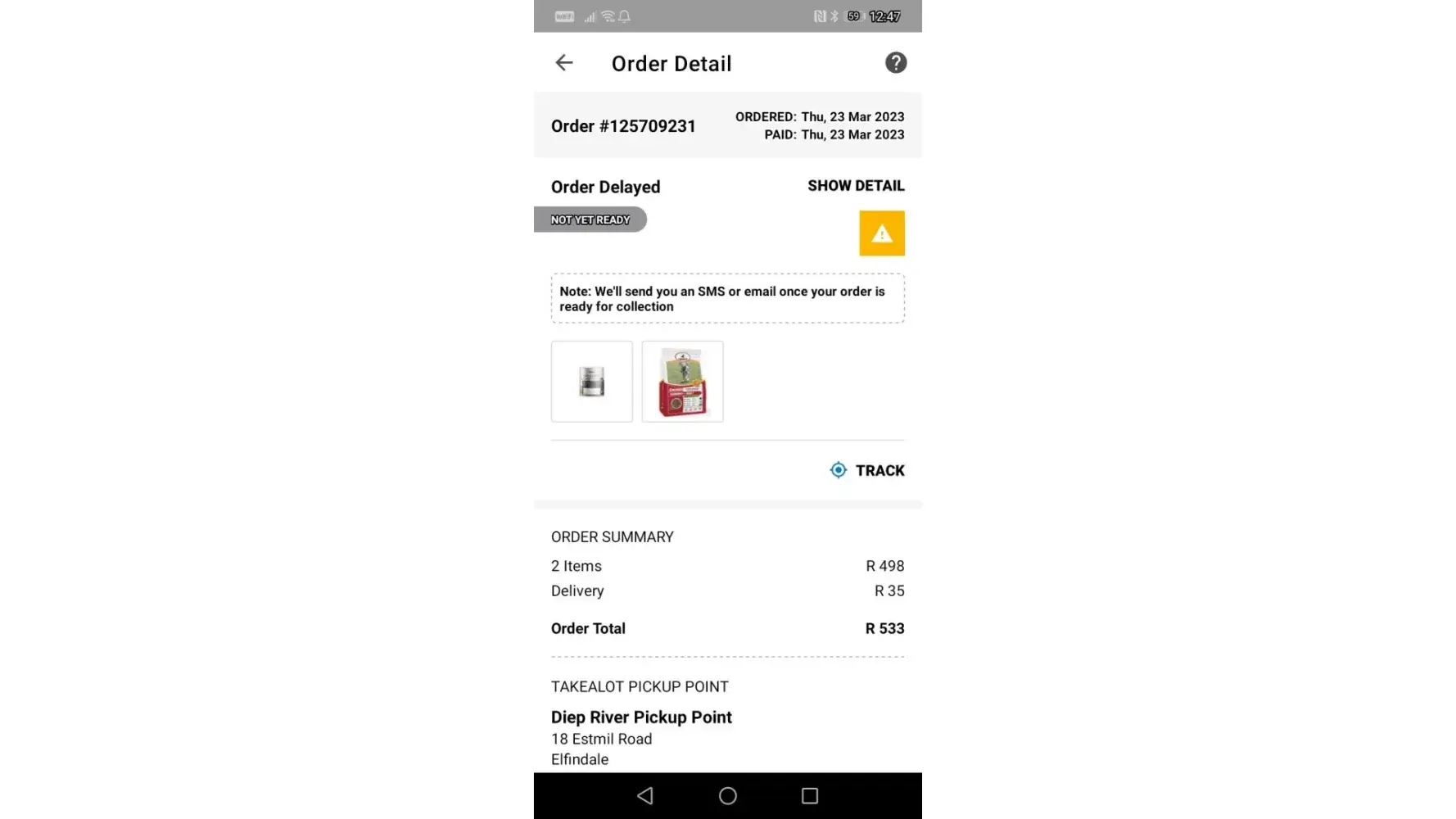 Hey take alot im very dissapointed, i have paid my installment for my order 11 of March and it was supposed to be delivered on 23rd march up today which is the 27th there is delivery, no apologies, no email to explain why my order never arrived, im disappointed really this is the first time your service is bad, also on 23rd march i ordered [protected] that i was supposed to collect the next also no apologies from takealot just a message saying delays on the app.