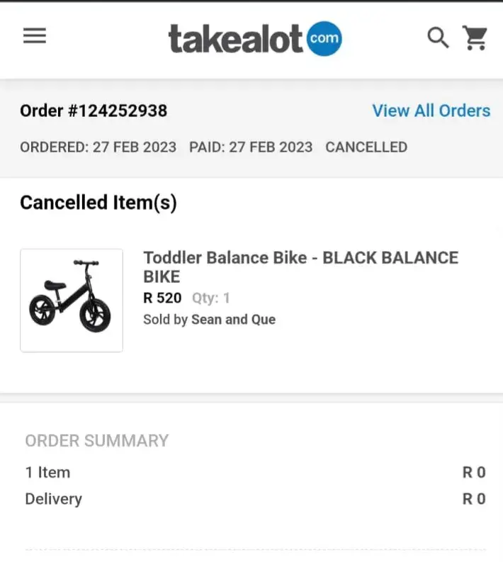 We have ordered a Toddler Balance Bike on the 27th of Feb and they only wanted to deliver on the 9th of March just to find out that they cancelled the order on the 9th of March. Nobody has tried to contact us regarding the order or the refund. This is totally unacceptable. Lucky, we ordered before our son Birthday.