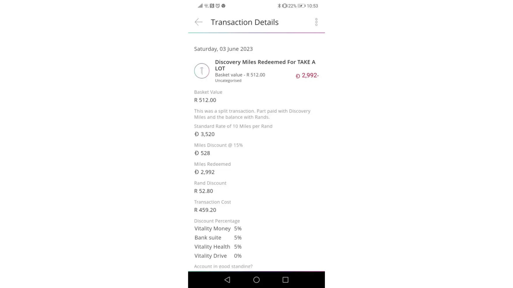 Payment R512 (R352 Discovery Miles R160 Standard Bank 3 June.