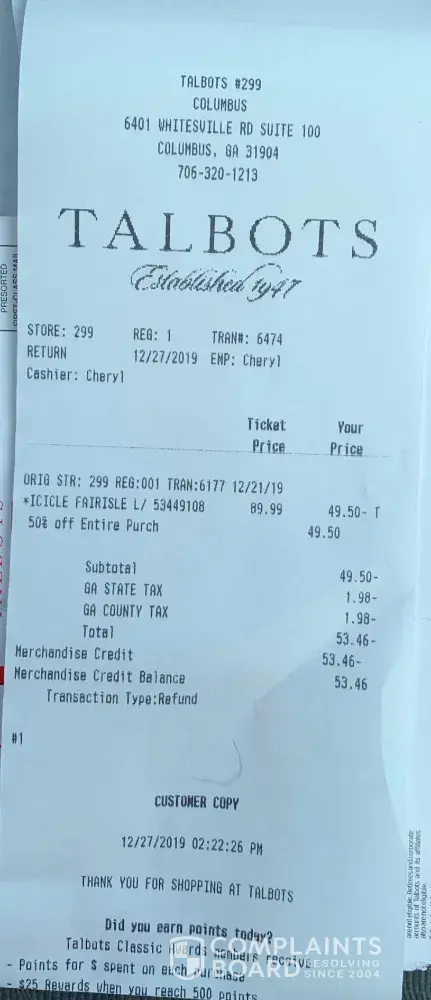 Talbots Talbots poor customer service - returned item - no credit