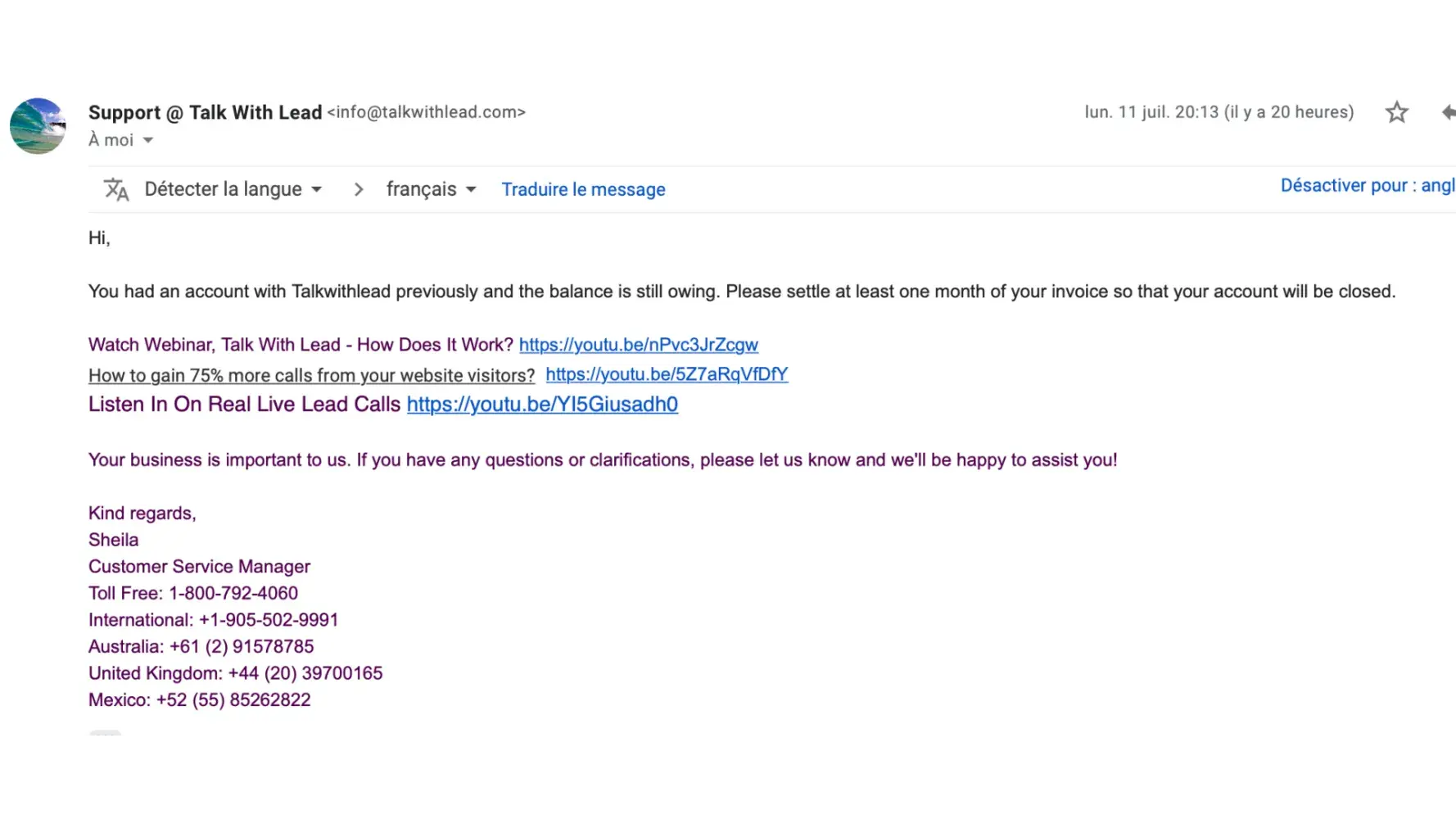 Talks with Leads is shamble of a scam. I have Received emails… my Account has been closed & satisfied. However, this company began sending me emails that I have a balance of $168.35 due for leads generator… (April-June) stopped, after I responded with issue addressing emails & images of the balance satisfied & closed. Now I’ve recently began receiving emails again (November) “Hmm 🤔†from a different address. There is not a account number on the email, only an amount of $168.35 and the suggestion to pay the invoice.
