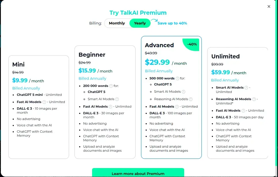 Here is the updated version of the pricing that is mentioned in the TalkAI banner (as of Aug 2025) with the screenshot also (the only changes are the model name "ChatGPT 4 or 4.1 or whatever is changed to 5"):