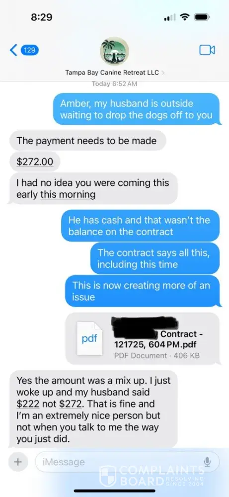 I booked boarding for my two dogs with Tampa Bay Canine Retreat LLC and paid a deposit to reserve specific dates. Our contract listed a 6:30 AM drop‑off time. My husband arrived at that time, but no one answered the door. I contacted the business at 6:48 AM, and they did not respond until 7:00 AM. Their first message referenced an incorrect balance, and...