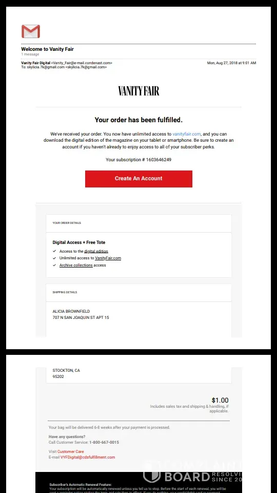 This is the same one I'm having issues with. Still haven't received my diamonds for the Vanity Fair offer. And it's like no other way to get in contact with someone to help just dead ends. It's frustrating.