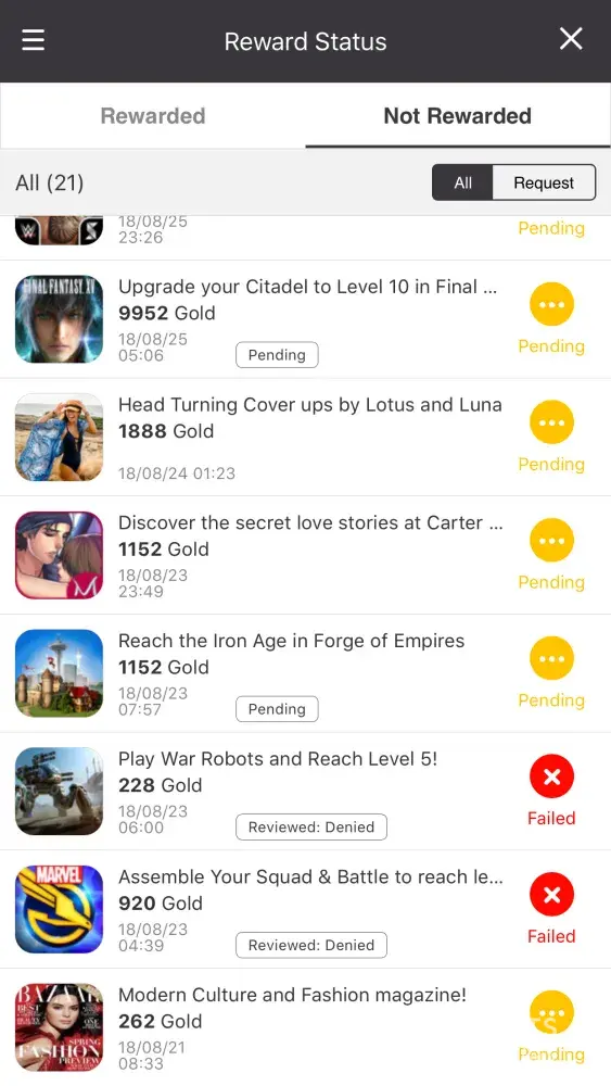 I've been playing this game and completing your offers for months now. I recently accidentally sent in a request for the same app twice. After doing that you guys have denied every request I have sent in even though they are all legit and this whole ting was caused by a mistake. I have sent proof for every offer I sent in but you guys will not respond to emails with the proof. It's really frustrating that you say everything is denied when you haven't even asked for proof like you normally do. I usually have no problem getting rewarded. Please help me resolve this as I am owed thousands of bars of gold from the game I'm playing and I've spent hours and money on the offers I've legitimately completed.