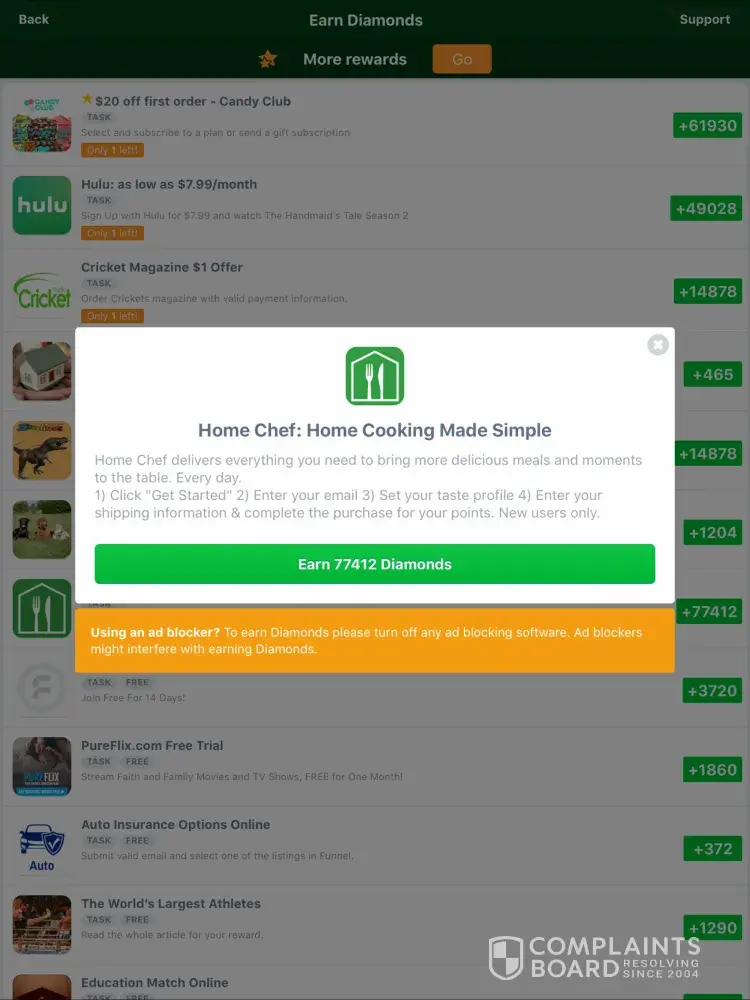 I completed an offer to sign up for Home Chef for 77, 412 diamonds in the offerwall on 7/25/2018. I was billed for the item and received it 7/31/2018. I have not received the diamonds. The offer for Home Chef no longer appears in the offerwall nor does it appear as rewarded or not rewarded in my status in the app. So I was not able to submit a request as instructed on your customer support site. I have documentation to