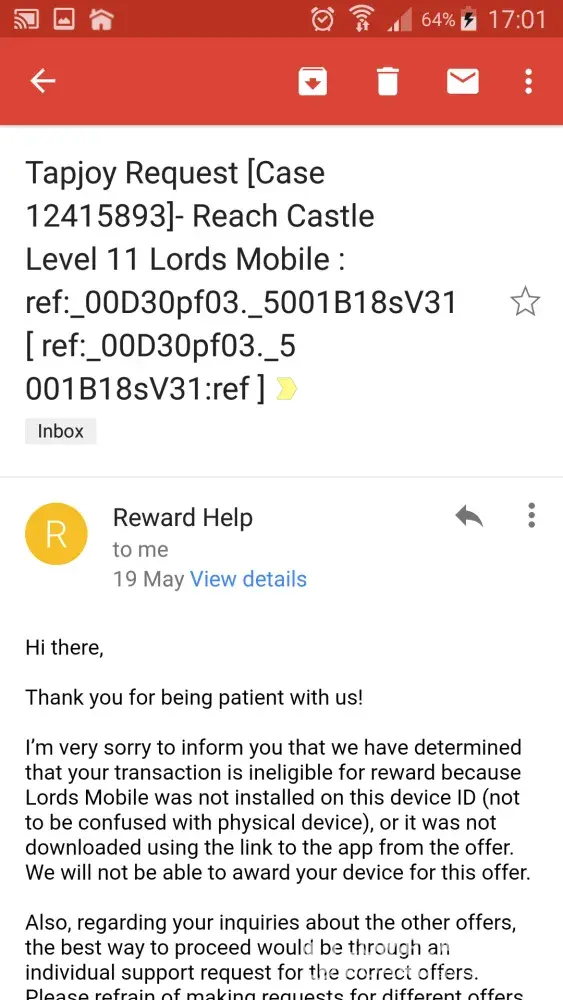 I, like many users have played various apps and have used their in app provider to earn currency to play the game. Tapjoy is one provider that consistantly fails to honor it's contract with players once they follow their promotions to earn in app currency. I have noticed when it comes to doing various things to earn this currency, if the payout is a small amount, you are more then likely to get the reward, but if the amount is large, your chances of receiving the reward is pretty slim. I have had 2 open tickets with this company, and if they don't ignore your ticket and close it, then they give you various excuses as to why it will not be honored. One of my tickets, I was told the app was not installed on my device. I then provided shots of the device with the app clearly installed and listed in the application manager. I was then told I did not download the app via THE LINK THEY PROVIDE. I then provided screenshots from the app that clearly shows there is NO LINK provided by them in which I can click and download the app. The next followup email told me my device ID had changed. This is what their email said.