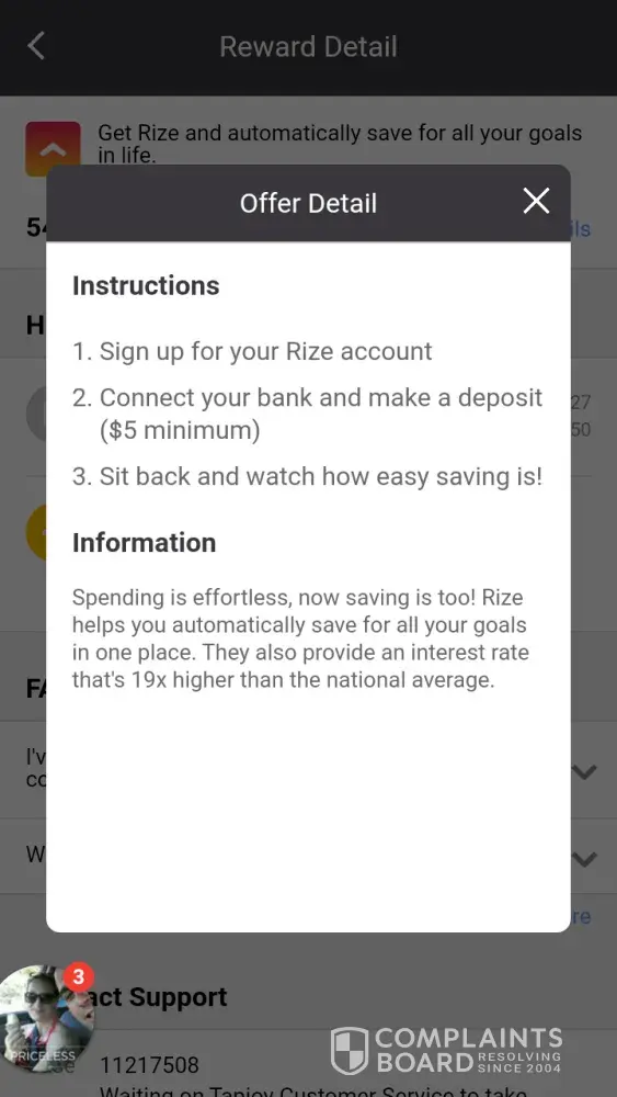 I completed this offer for Rize money management but I did not receive all my 5440 diamonds for completing this offer where not only I have to link my bank account information but then I have to deposit at least $5 to start to receiv7y6e the diamonds so.. I contacted tapjoy letting them know that I didnt recieve my diamonds. So i sent them an email back just showing them a picture of me signed up with the website.. and I haven't heard anything back since, I've had 5 other request answered and handled since then.i have all the proof I completed the offer I just want my diamonds..i don't want to go to BBB and report you. Bc I enjoy tapjoy. Just please take care of this matter