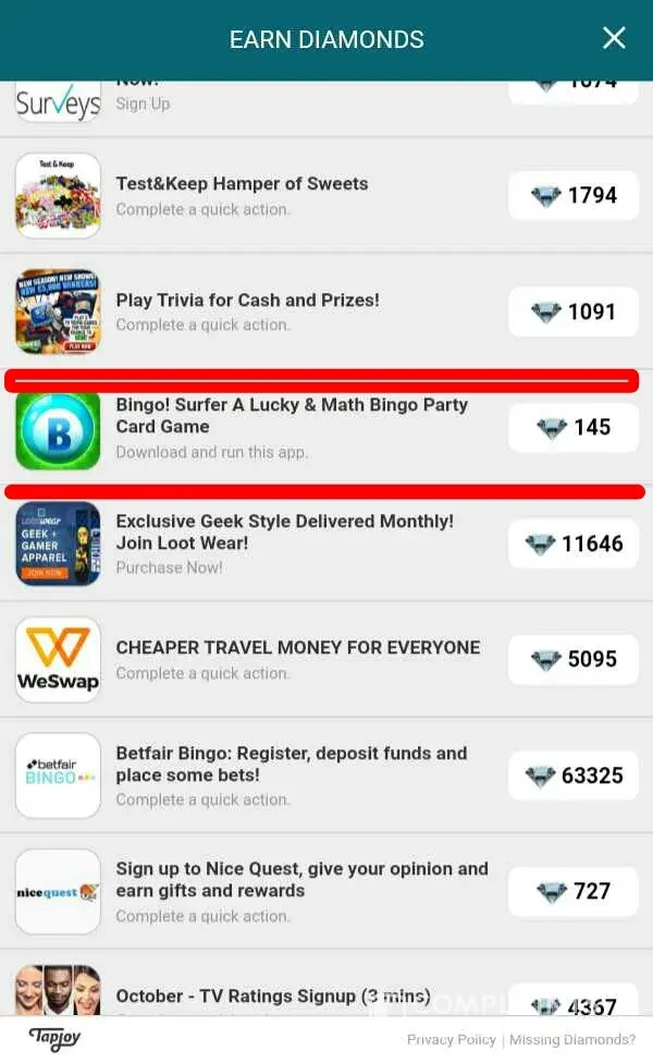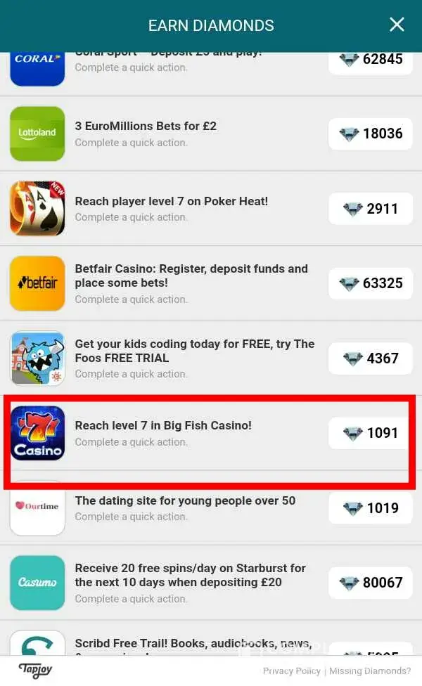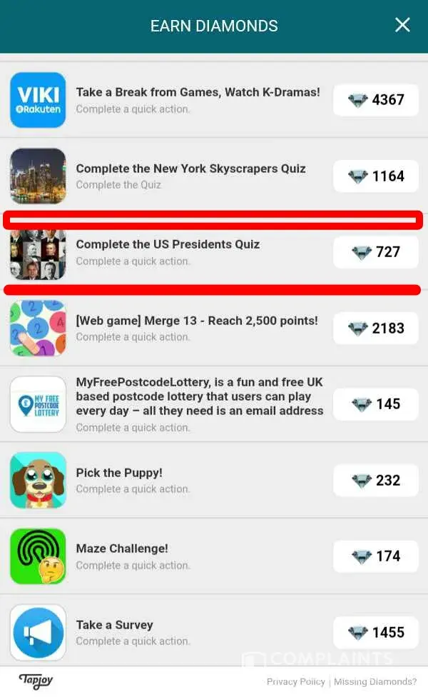 These offers are no on the missing diamonds feature. I have screen shots of all these results. I have done many offers in the past and it has worked perfectly. However, this is a been a great upset to me. Please respond as soon as you see this before I make a formal complaint.