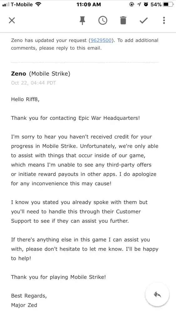 I signed up to receive a currency reward for the game in the title. I needed to reach level 10 of mobile strike, which took about 10 hours- I have never received my currency reward and they will not answer my support requests. This happens all the time, you have to follow up and then if they respond, they say it was rewarded but that’s not true. The case is then closed and no response from them moving forward