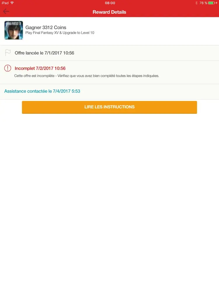 Hello I rewrite you for the final fantasy game I still have not received my 3325 gold I completed the offer July 3 at around 22:00 pm canada time you promised to remedy it quickly I have screen i have all information for confirm my identity I reply ans send thé screen by you email and Notting again... I am on level 11 for cityzen ! I have registred the game ! With my Facebook and i confirm my registred on the game by email vérification too! You send me this answer ** Please be advised that we have recently had an increase in requests from our users. As a result, we are a bit behind in responding, but please know that we have not forgotten about you, and are working to get caught up as quickly as possible **