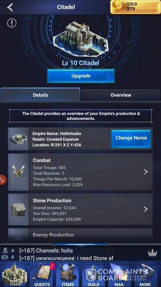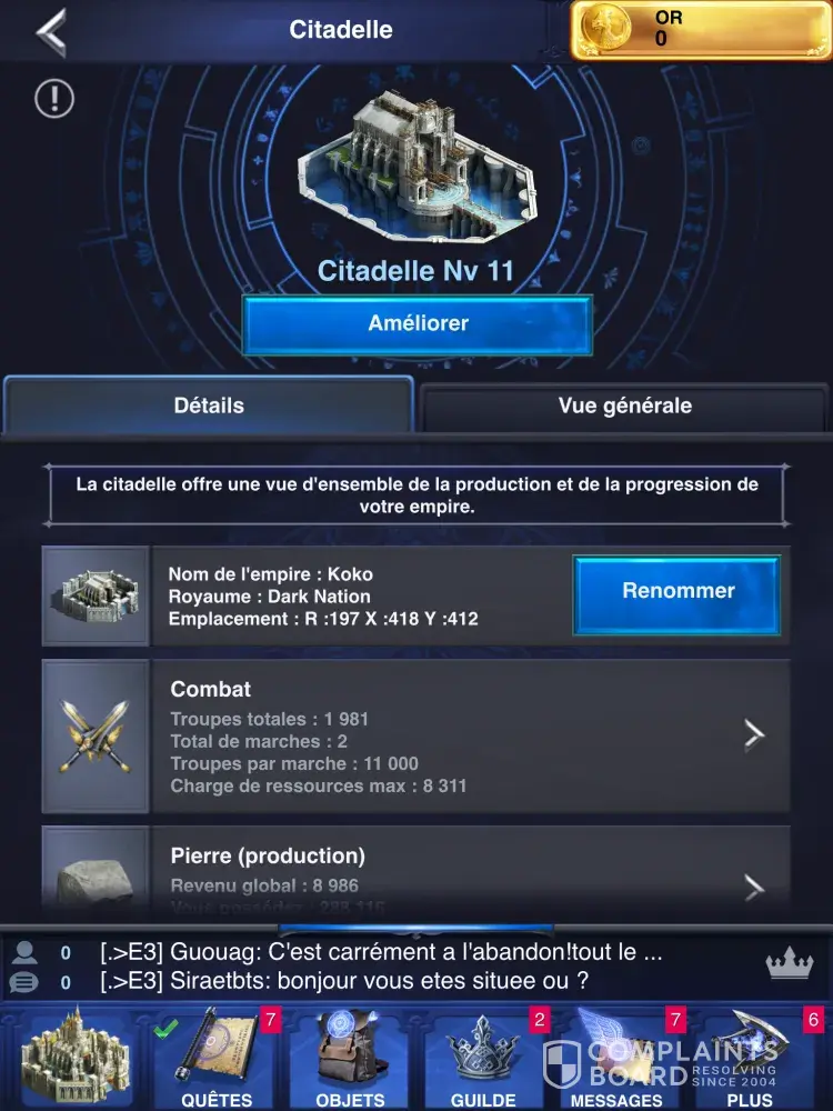 I have not received any response from you regarding the ticket I filed regarding the 193 gems I have yet to receive. I play the Game Age of Kingdom and the offer was to download final fantasy and upgrade the Citadel to level 10. It took me over 3 days of hard work to accomplish this and I feel that I've been ripped off. I'm attaching screen shots to prove my claims.
