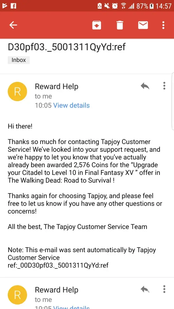 I completed an offer to upgrade my citadel in the new final fantasy game in order to recieve coins for TWD RTS game i completed this offer within 10 hours and advised that the coins had been rewarded. I contacted your customer support who advised that i had been rewarded which i hadnt and to contact scopley. I contacted scopley who confirmed that i had not recieved any coins for yourselfs and to contact tapjoy again. I responded to your email as it would not allow me to submit another request and i also attached the correspondence in the form of screenshots. It has been 3 days now and i still have not recieved a responce and still have not recieved my coins. This is completely dissatissfactory customer service all i would like is this problem rectified.