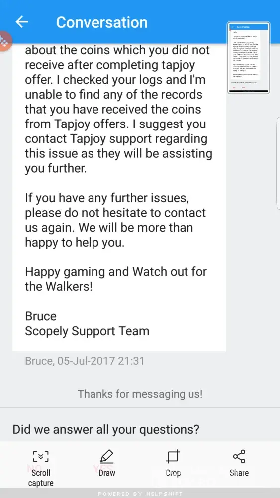 I did a offer for 504 coins for my walking dead game using the free offers thru tapjoy. I did everything I was suppose to do an have wrote several times with no response back except from a automated reply. its been almost a month an still nothing. all I want is what is due me. the offer was for a twitter account. Tapjoy Request [Case [protected]]- Install and Register for Twitter! : ref:_00D30pf03._5001311OsVi:ref