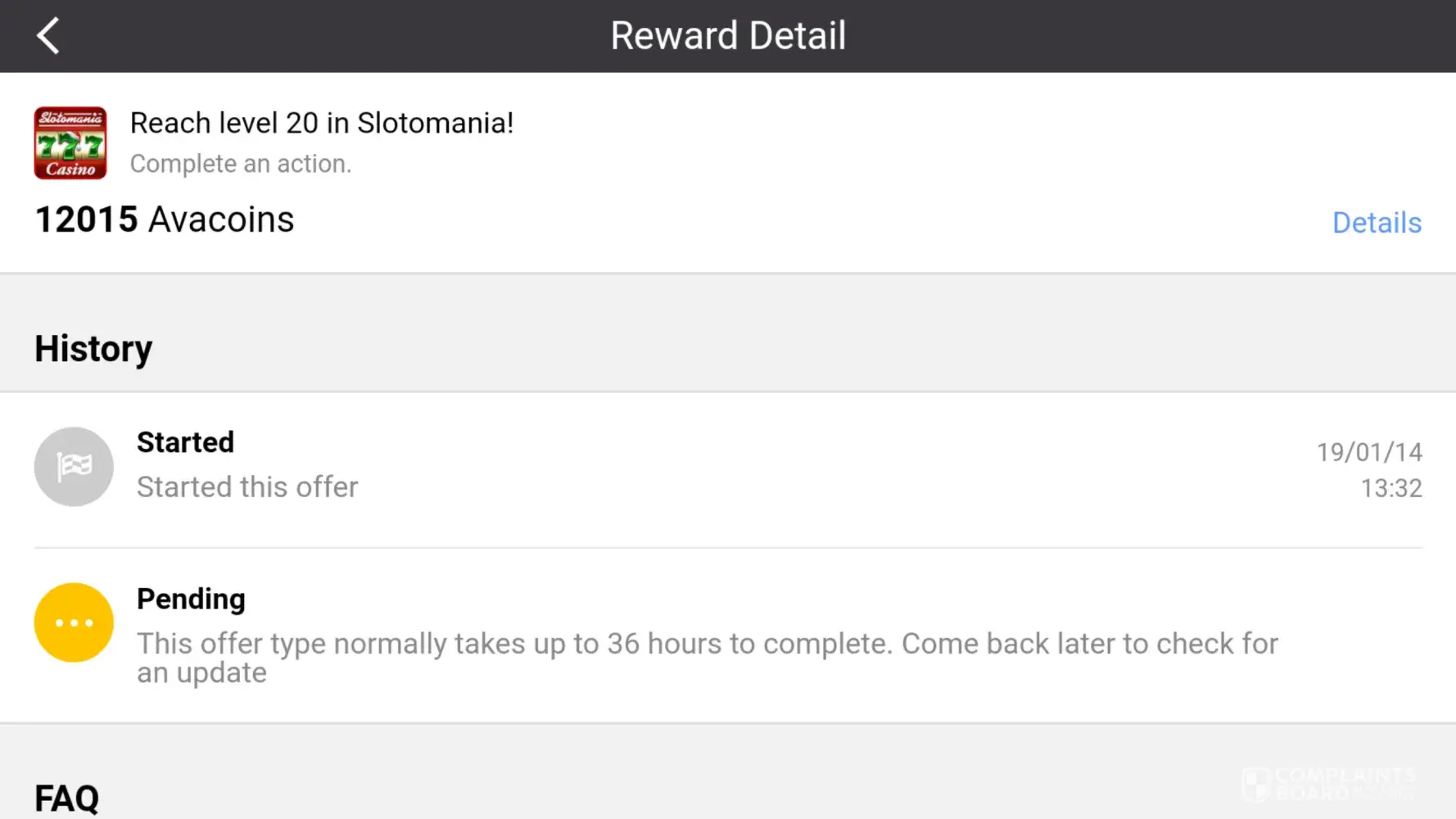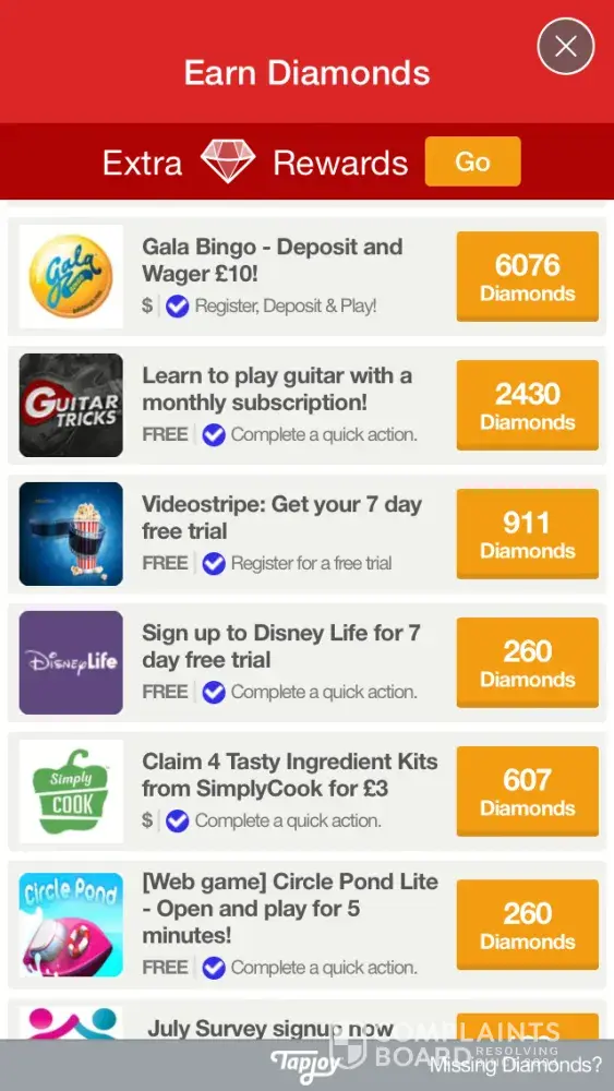 After doing so I received no diamonds and the offer also remained on the list as If it were not completed, therefore leaving me unable to complete a complaint form as the offer wasn't showing in the completed section.