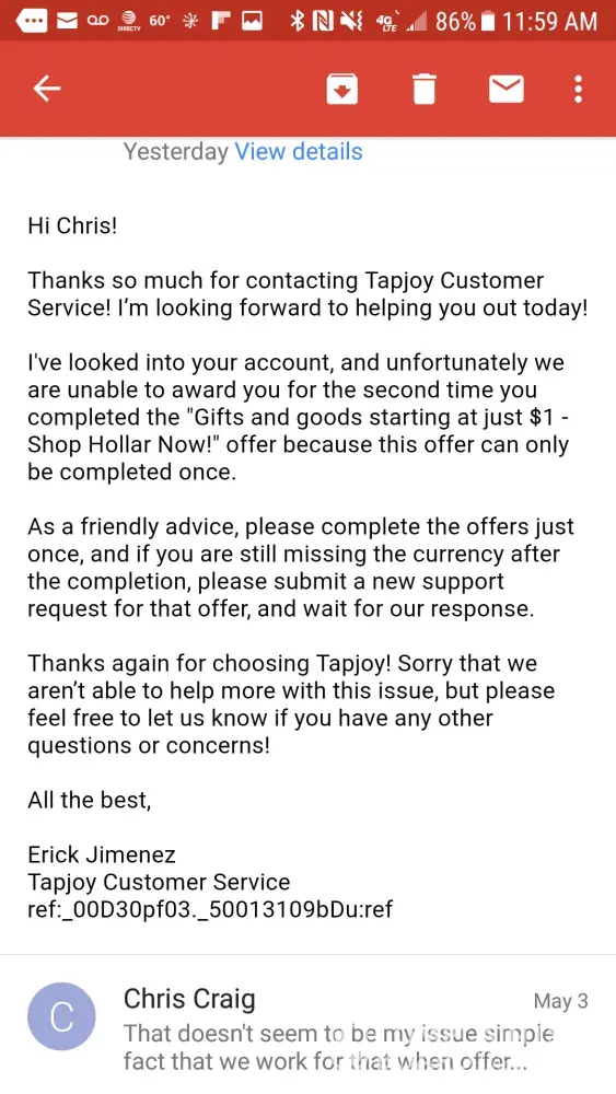 I have been trying to complain to Tapjoy about this since 26th April and no one has properly read my emails or replied.