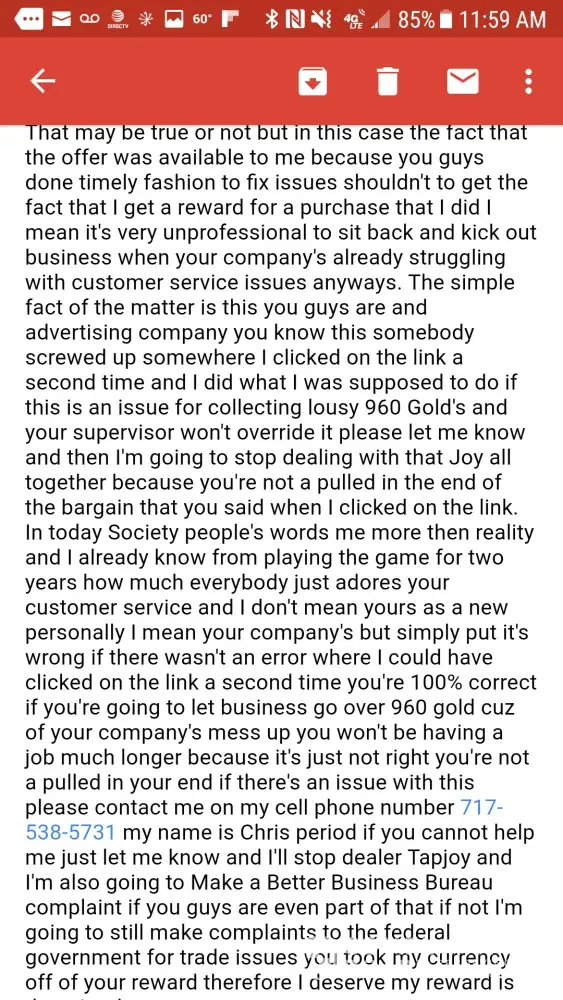 I have completed the game of war upgrade stronghold to level 10 days ago. I have downloaded tapjoy rewards app to track rewards and it says offer not complete. This is incorrect. I have contacted customer service through the tapjoy app and have not been contacted by anyone concerning my complaint. I have also completed a few others that have not issued the rewards as well. I have spent a great deal of time completing the game of war offer and have spent actual money to do so. The track rewards feature in the tapjoy app is not very user freindly. I cant access the rewards customer submission form. Tapjoy has wasted a great deal of my time and subjected me to hours of ads and conned me into putting effort and money into offers without recompense advertised by you. I want to know what tapjoy intends to do about it. Why was i issued rewards when i upgraded my srikeforce headquarters to level 10 and not for game of war? Why have i not recieved my rewards from Harry's Razors when they have already shipped my order?i want to be contacted by an actual person. My only other recourse after this is to contact the companies that have hired you and that advertise with you. I will be forced to file official complaints where ever i must. I have completed these offers through Topps Huddle. My email is [protected]@yahoo.com. my phone number is [protected]. This is very shady business. Someone is not doing their job correctly. When i researched online, i found that this is an ongoing problem. After a few years of issues, seems like it must be intentional at this point. No business can operate with such deficiencies and continue to still be viable. You are either conning me your customer, or you are conning your clients or employers. Fix the problem please