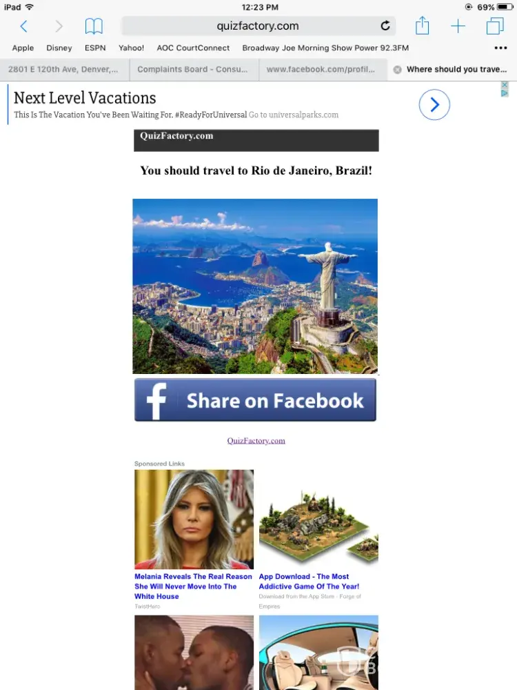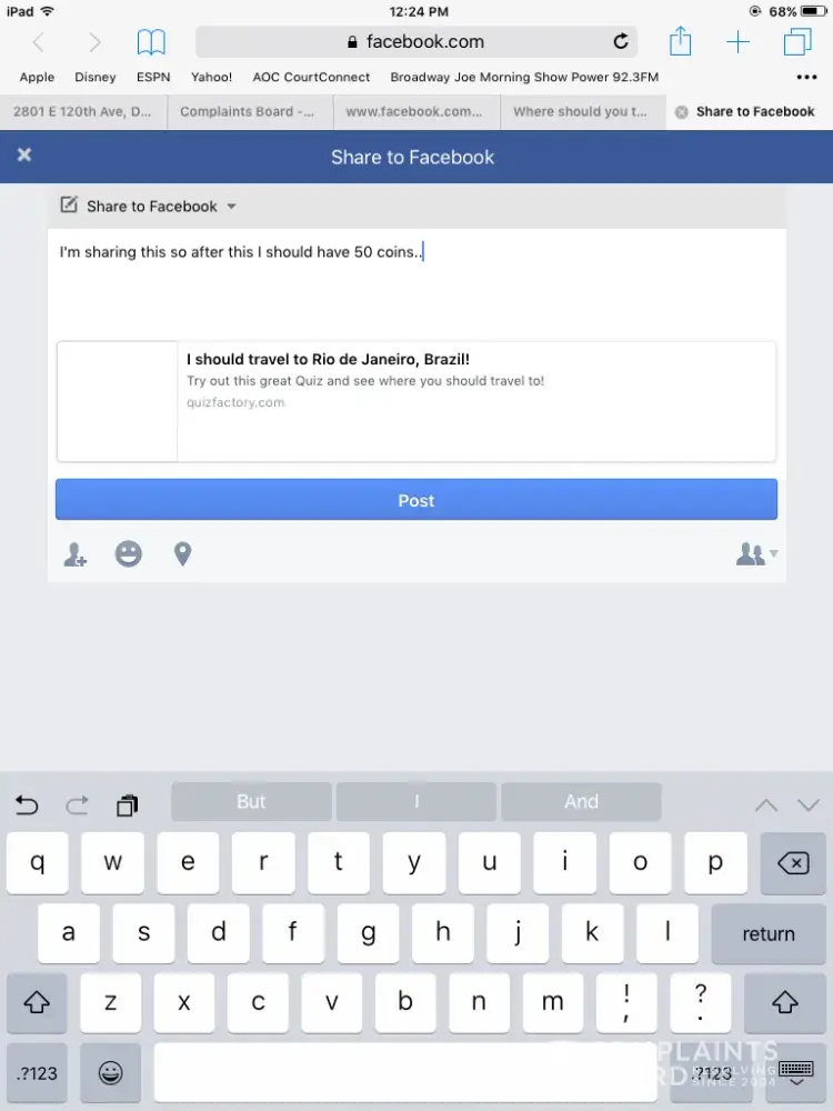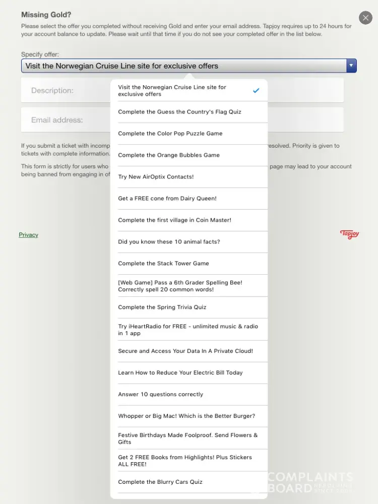 I'm uploading the pictures this is a scam. Did everything and still wasn't rewarded my gold then when I tried to go report missing gold it pulls up a totally different game tht I didn't play even though I have all the proof and my Facebook page clearly states tht I took the quiz and passed it... Tap joy Facebook page have a lot of the same complaints.