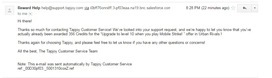 My husband does the "TapJoy" thing for Star Wars Card Trader. In March, he ordered flowers for his mother...$70 put it was 584, 000 credits. We got the usual "send us proof" email and then nothing. No replies, nothing. This is common with them. It's so frustrating. I could have gotten the same flowers, cheaper but without the precious credits. They had another offer with the same company for Mother's Day, I wouldn't let him order, I'm tired of the complaining every day about how he still doesn't have his credits.