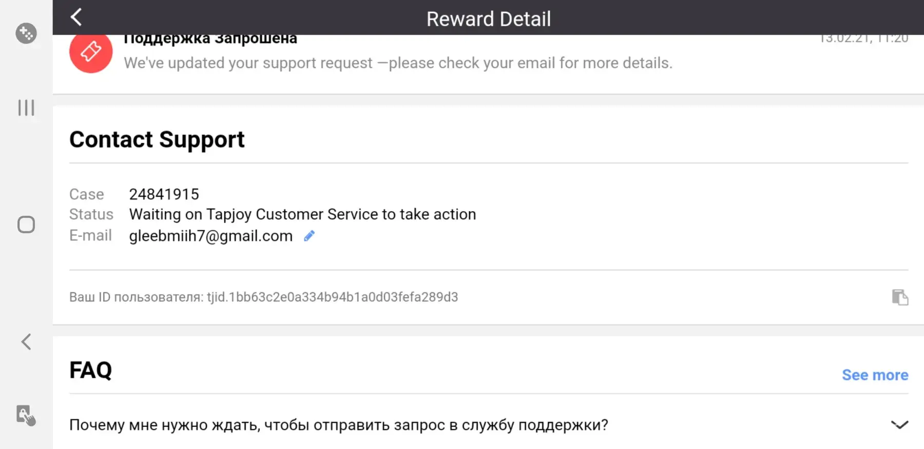 Служба поддержки tapjoy уверÑет что вознаграждение выÑлано, Ñ…Ð¾Ñ‚Ñ Ð¿Ð¾ факту Ñто не так.Мой имÑйл [protected]@gmail.com