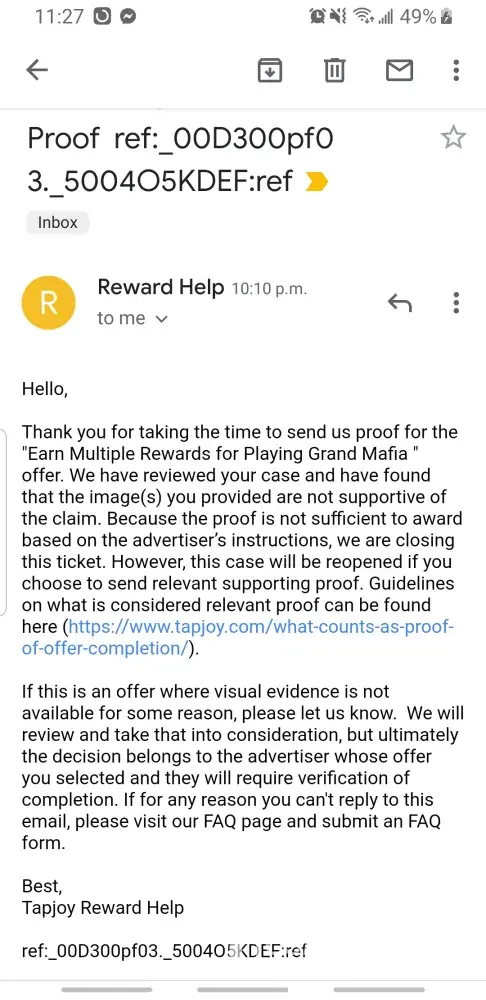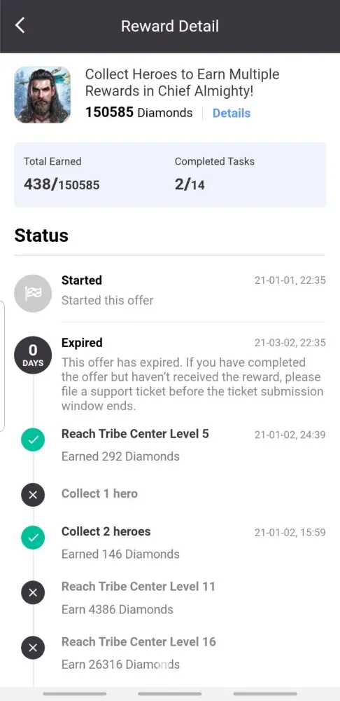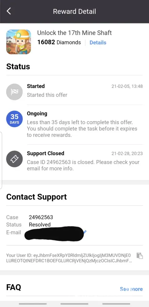 I was starting a offer called "Open 2 Void Shards in 10 days!" for Raid Shadow Legends on July the 5th, 2021 17:37. After I have completed the offer, I was given a status update saying that my offer had failed to reward me. Just a little bit after the status update, I had quickly submitted a ticket about my incident. They proceeded to give me a bot emails saying all the alternatives that may occur for my offer. A week later no response and the offer was near expired. So I went to your support twitter account '@TapjoyCS' and they helped me the best they could. They were able to get me an email from the support telling me that they would give me a reward on July the 15th, 2021. That email was the last email I received from them saying they had resent the reward, but I have yet to see it to this day. Shortly after the offer expiring, I was left with no reward and just feeling anxious throughout the whole case. I am very displeased with the little feedback I was given from support and I certainly hope something will be done.