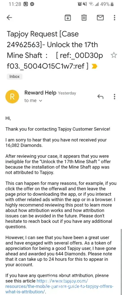 I use to always have excellent customer service with these guys but now they seem to look for any excuse not to reward me when there is a problem and they are giving me links that do not answer my questions. One I just received said my evidence was not good enough and closed my ticket. The link they gave me was for submitting proof of purchases which does not help me at all. Over 130, 000 diamonds have not been rewarded to me and even though I was able to reply to a other email this one I can not. In another email they said they could not verify a download which happens very often and refused to give me my reward.