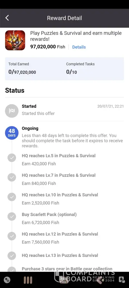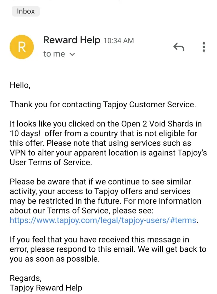 so I had to open 2 void shards on the game raid which I ended up doing and proved I did then they said I was eligible for the reward but they had to send it to the advertisers to verify it and if I wasn't they would either suspend my account or give me a reason why I was not given it and instead of giving me reward or sending a e-mail telling me I was denied they just put as my case was resolved and if no one answers me I don't care I will be taking legal action against them for false advertising and scamming me this has been going on for 9 days now and im ready to sue