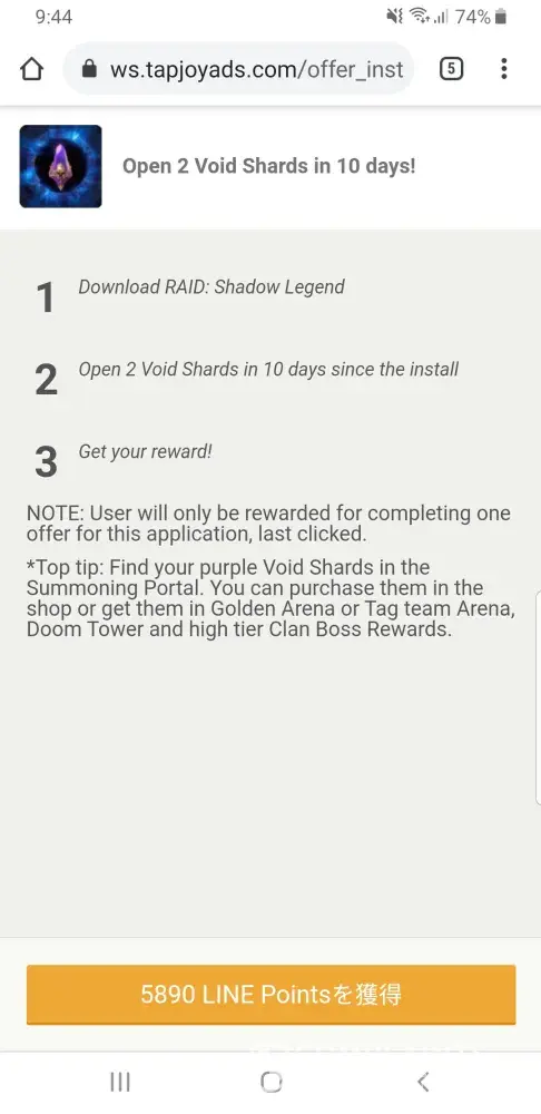 Tapjoy offer via LINE application (opening 2 void shards in raid: shadow of legends)