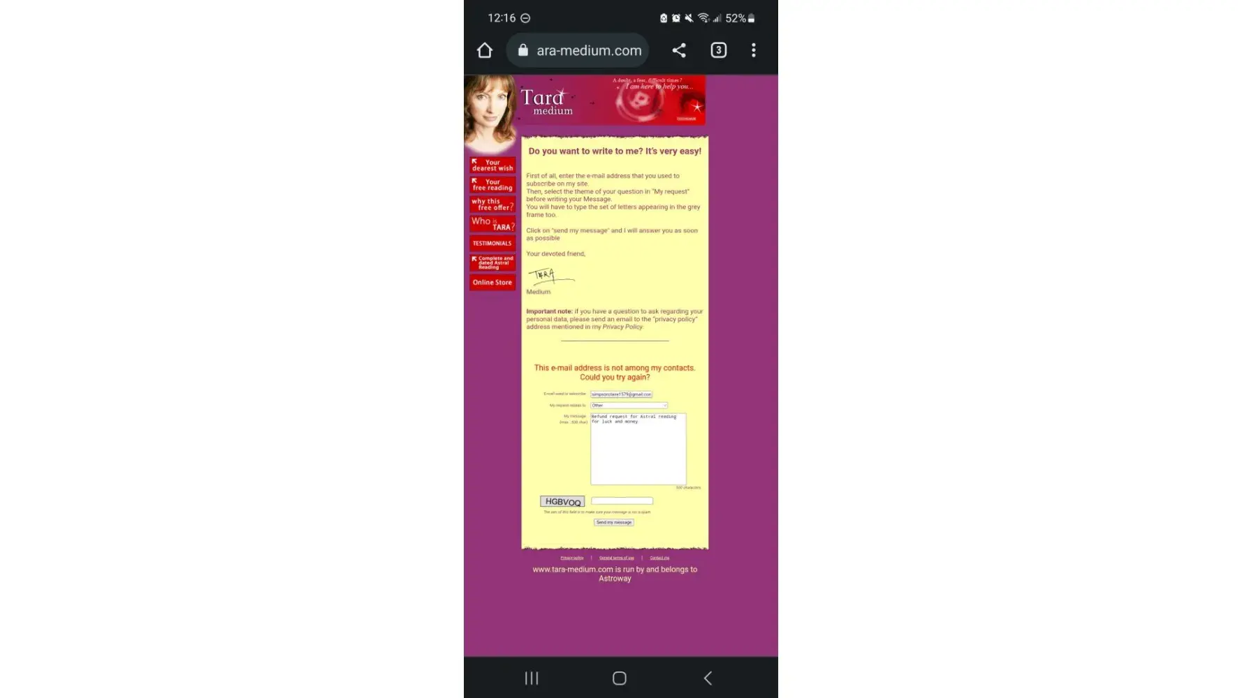 I visited the Tara visionary medium website and got a free reading, following this I purchased an in depth reading from her with the promise that if I was not fully satisfied I would receive a full and fast refund, no questions asked on request. I never received the reading. I never received a response to a refund request sent over 4 times to her listed email address: [protected]@taramedium.com