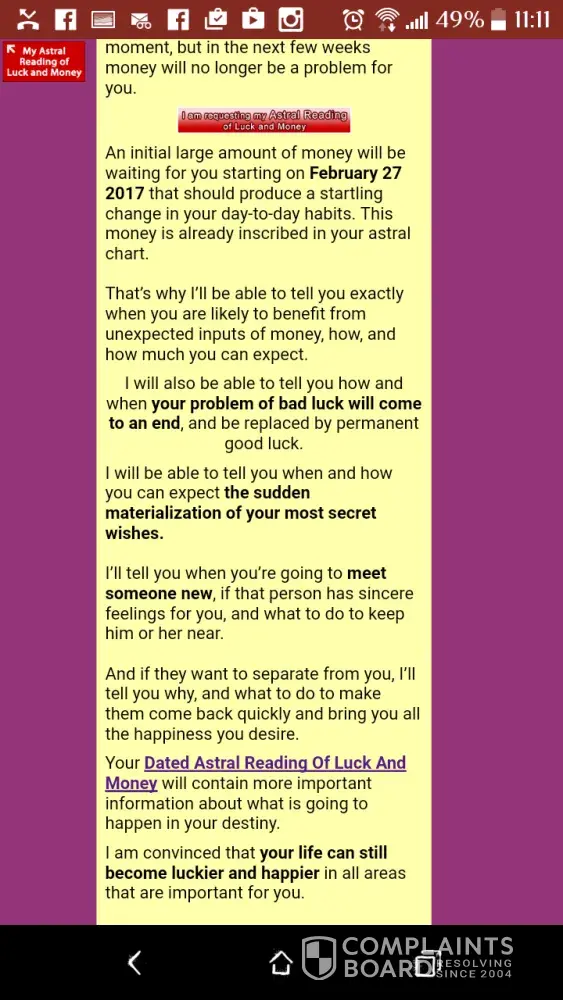 I've sent SEVERAL urgent emails requesting a refund, you over drafted my account this morning taking MORE MONEY when u promised to refund me if I wasn't satisfied. In our messages PLEADING ME to get the "detailed" report for luck and money you said that u would tell me what games to play on what days and what numbers to play for said corresponding games. Instead I got a generic horoscope that I could have gotten for 50 cents out of a newspaper. Not one the months does it say what games to play! I got a FEW days for POSSIBLE good luck,