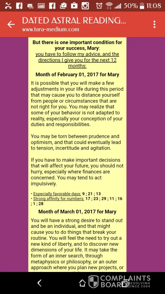 (more days of bad luck) even though u CLAIMED I had 3 months ahead of me with nothing but good luck, and u gave me a hand full of FORTUNE COOKIE lucky numbers. In the report it said stuff like I would enjoy food; ARE YOU SERIOUS TARA! You DID NOT DELIVER by any means. You said one thing, and gave me another, THEN wanted $300 MORE for a telepathic communication. Which if your even remotely as powerful as you claim you would know I don't have that kind of money. Not that I'm afraid to spend it; I DONT HAVE IT! I'm a single mother of 4. My youngest son has cerebral palsy, which keeps me from working. Yes we struggle, and I really wanted you to be telling the truth. I didn't pay for a horoscope I paid for u to tell me what games to play on SPACIFIC days and what numbers to play on said games. The LOTTERY is too vauge. Where I live there are SEVERAL LOTTERY games, and I would need to know which ones I could win on. You lied Tara, I feel like your not even real and its just a bunch of ### pretending to be you scaming the desperate. Because if I wasn't desperate I wouldn't need help and u know that. I want a full refund of everything i paid you! I could have gotten my yearly horoscope for free, and that IS NOT WHAT U SAID U WERE PREPAIRING! You said if I put my trust in you and got my reading for luck and money u would give me specifics on what to do and when and that is clearly not even close to what I got. Stop charging my card and return the money u took PLEASE, I don't get any more money till 5/3/2017 and today is only 4/12/2017 what am I gonna do if one of my kids gets high fever? Haul all 4 of them to the emerhancy room? When I COULD HAVE just ran to the pharmacy with the little money I had and bought a bottle of Tylenol fever reducer? What am I gonna do when I run out of toilet paper? Or milk? Or my kids want popcorn on popcorn day at school? I know the money you took isn't much to most but I could have made that last till the end of the month. I do it every month. Your not a nice person or people what Ever u are, you guarantied a refund if I wasn't satisfied and I've asked SEVERAL times via urgent email for a refund but instead u keep taking MORE money. Not to mention if u make people pay for something you shouldn't take it back after 30 days. The only reason u do that is so people who are not like me and don't have a extremely good memory don't realize how wrong even your vague ### is. You promised a refund and I'm basically begging now. I NEED that refund Tara! I wouldn't ask if u delivered what u promised. I wouldn't even need it because I would have won the lotto. I tried my "lucky numbers" on a day of "strong affirmation for luck" in february and since u didn't tell me what game to play it on, OR cuz u where wrong wrong wrong...guess what I LOST, so return my money OK.