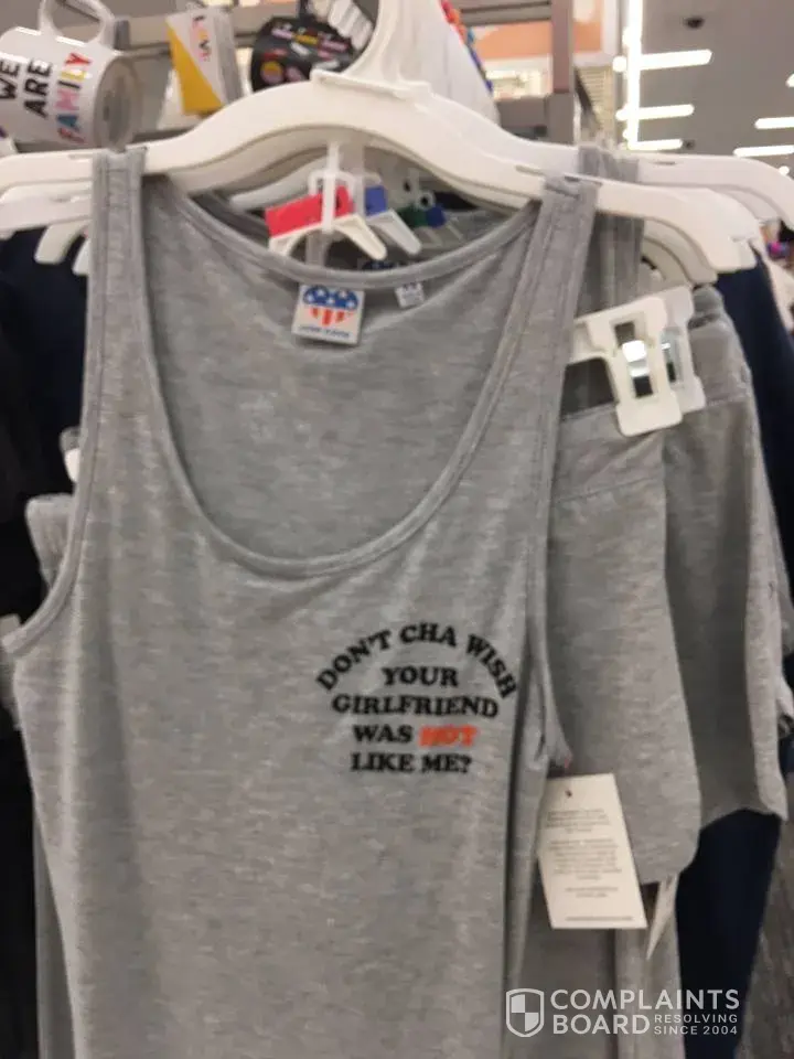 A sleeveless T-shirt, with the wording "Don't cha wish your girlfriend was hot like me" was in the girls' department at a Target store in Austin, TX. It is totally inappropriate and I want your assurance that these suggestive shirts will be removed from all Target stores. Please tell me where/.how to send you a picture of the offending shirt if one is not attached to this message.