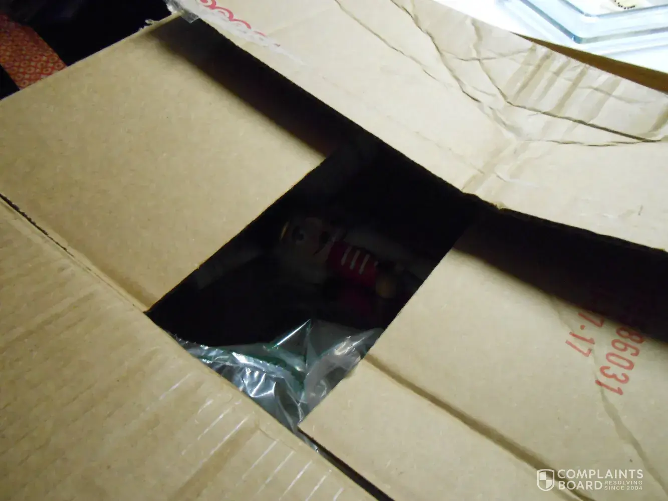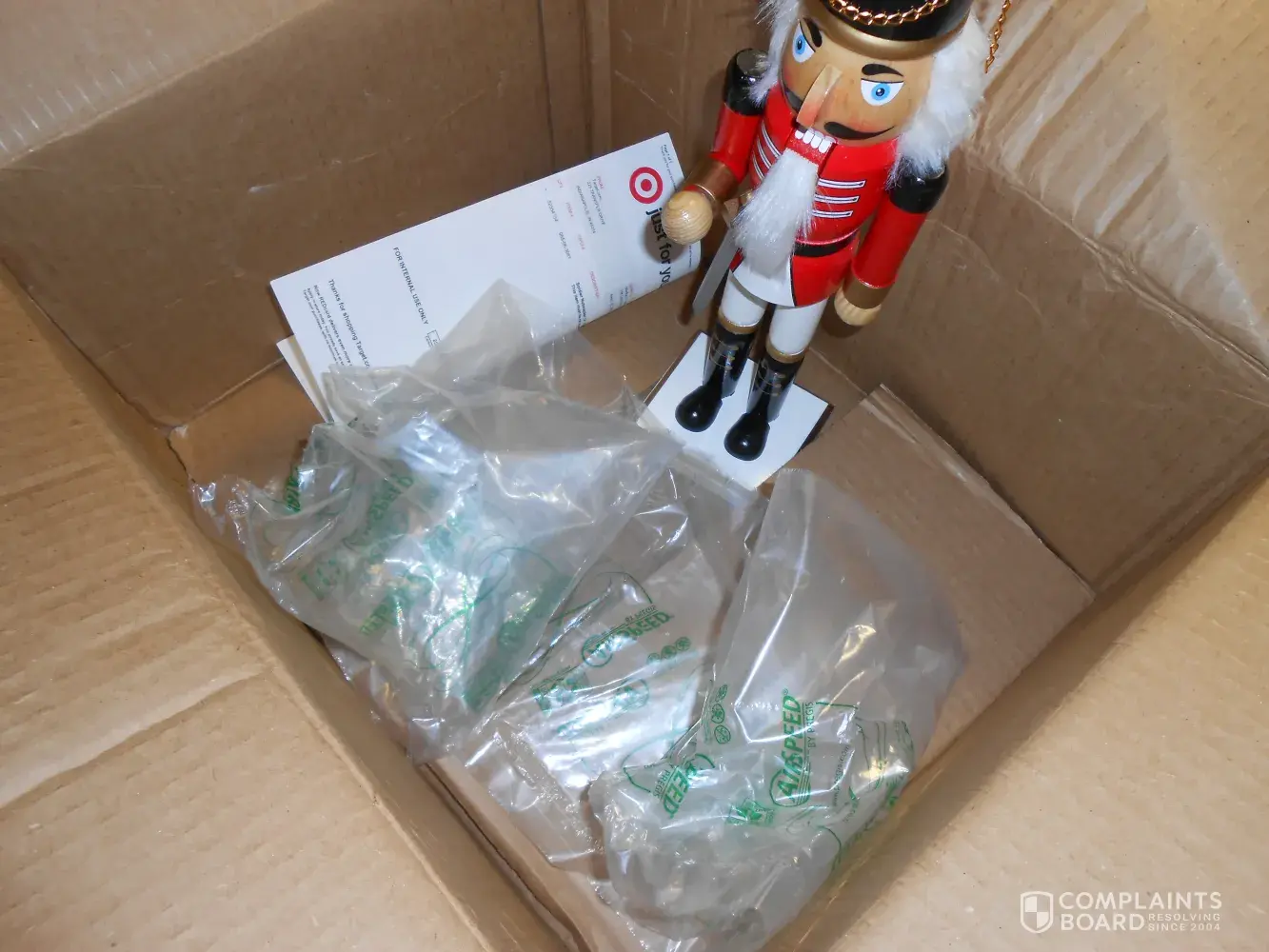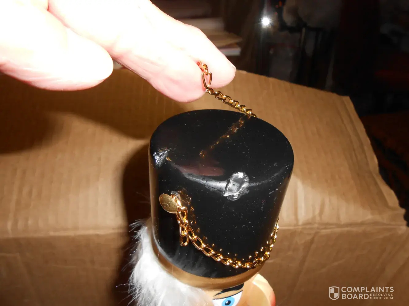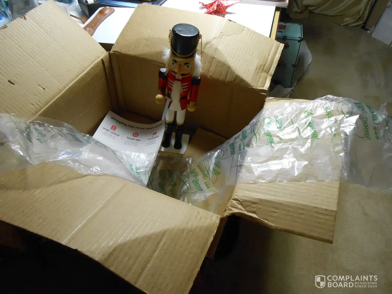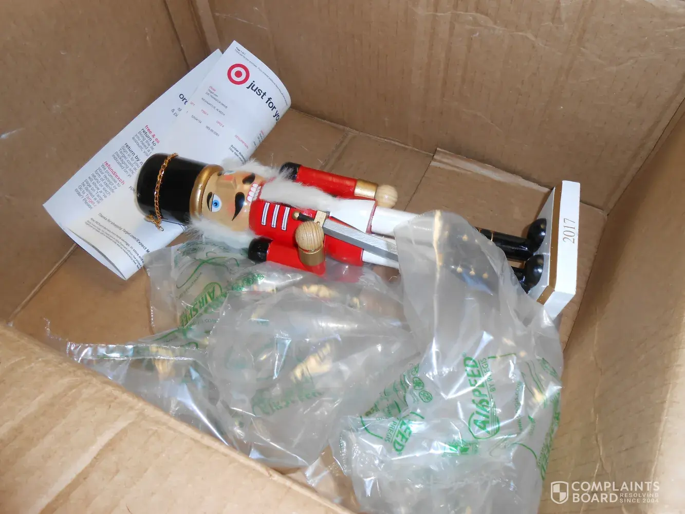 ORDER # [protected] - Placed 12/01/17 - received 12/07/17 --Ordered this Nutcracker figure online to avoid traveling miles to the store etc. It arrived in a very large, damaged box, the item loose and had banged around the whole trip obviously, with about a yard of "plastic air pillow packing" with mostly NO air in it and it was laying to the side of the item. No attempt to protect the item was made. Needless to say, the figure was damaged and broken. Because of the outside condition of the box and the noise inside, I took pictures during each stage of opening.