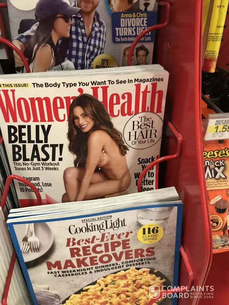 Today as I was checking out of Target in Foothill Ranch, CA, my six-year-old son pointed out to me that there was a nude woman on the front of the Women's Health magazine right next to the candy display. Needless to say I was shocked and quickly hid the magazine from my eight-year-old daughters eyes as well. I went into target to buy diapers for my 1 year old baby and drove home with my older kids asking questions about the naked woman on the magazine. This is not the reputation Target wants to have and I highly suggest you remedy the situation by having all front store managers pull this magazine as soon as possible!