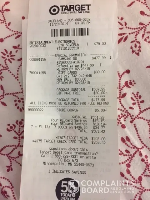 On 11/29/2014 I bought a 50 inch LED Samsung Television with the following serial number: Z5HU3CBFA10791E, and Model Number: UN50EH5000FXZA, i also purchased additional appliance insurance provided by Target for the amount of the cost of purchase of the product. the identification number for the additional guarrantee is #T1101265510. I made this purchase at DADELAND TARGET on 11/29/2014. Please see receipt attached.