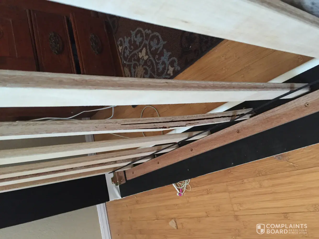 I bought this frame a year ago to be used in my guest bedroom. I am enclosing pictures of how the frame shattered along with the several of the slats after use.