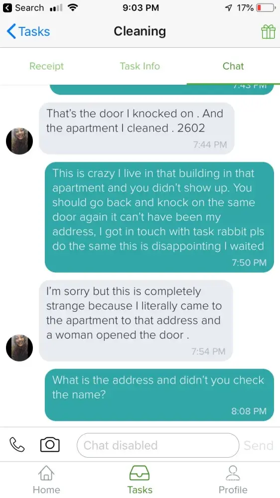 The person did not show up to the appointment but had the audacity to say that she was there and cleaned and that she was let in by a female whom she assumed to be my wife but never asked for the name. I was there the entire time waiting for the person. I was charged non the less and would like my money back. Furthermore, I've contacted taskrabbit and they said they would attend to me in 2 - 3 weeks. I feel helpless and though I've been fooled and probably tricked by someone who does this strategically.
