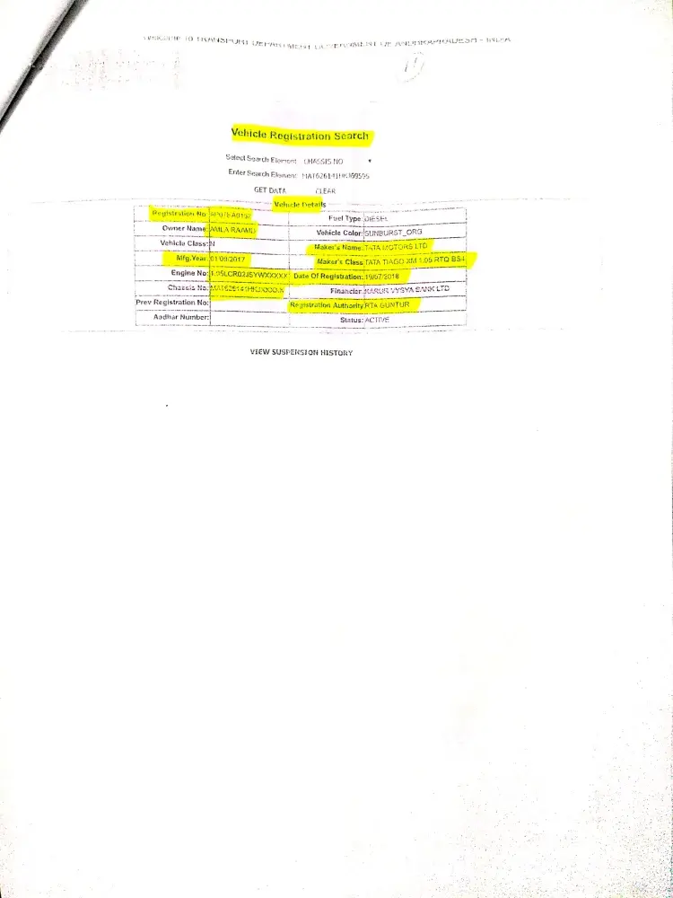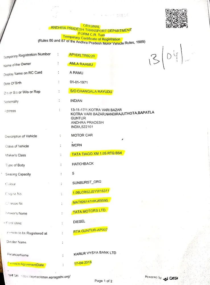 i.e Tirumala Automotives Ongole Prakasam District A.P, the vehicle