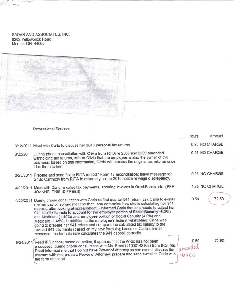 We hired The Sadar Group in Mentor Ohio to complete our 2010 tax returns for our company. They then offered to amend our 2009 taxes stating we would get back an additional $4000. The cost for them to get us our ammended return was $2000. We paid the $2000 and over the last 5 months, we have had a lot of problems with the IRS and RITA in regards to form...