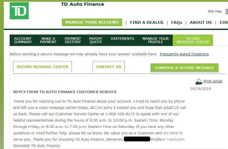 Simply put - do not waste your time using TD Auto if you enjoy the convenience of handling everything online through a nice organized web page. Their website is so poorly laid-out and managed that you will have no idea what your payments are and how they are being applied. They have a handy secure message option on the website, but they are incapable of responding via email through this option - you will only receive auto-replies that include symbols making it appear as if this whole thing is a scam (still not convinced it isn't at this point) - see picture for email response which have typically looked worse. These auto-replies are only capable of saying TD Auto cannot respond via email and you must call them... which is a waste of time, unless you enjoy sitting on the phone for an hour to remedy absolutely nothing.